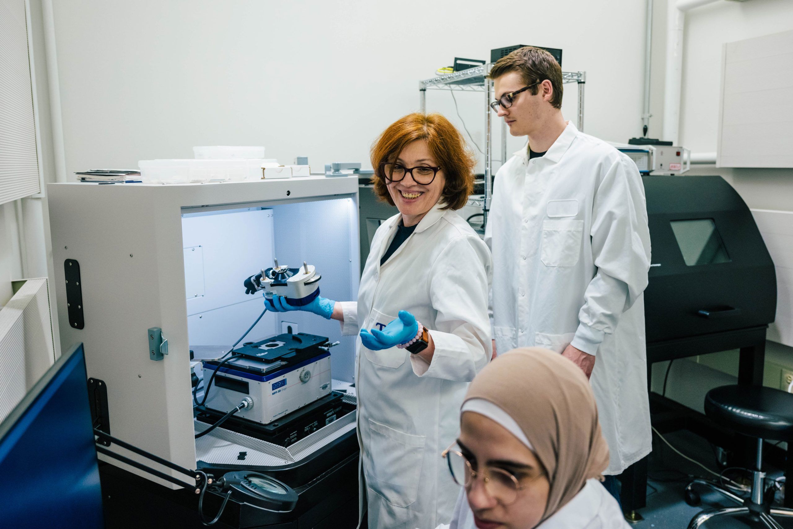 Dr. Ignatova and two of her students wearing white lab coats standing in a laboratory with arms crossed. Behind them are shelves filled with boxes and equipment, a blue wall-mounted paper towel dispenser, and a mannequin torso wearing a green tactical vest. The workspace includes various lab tools and supplies.
