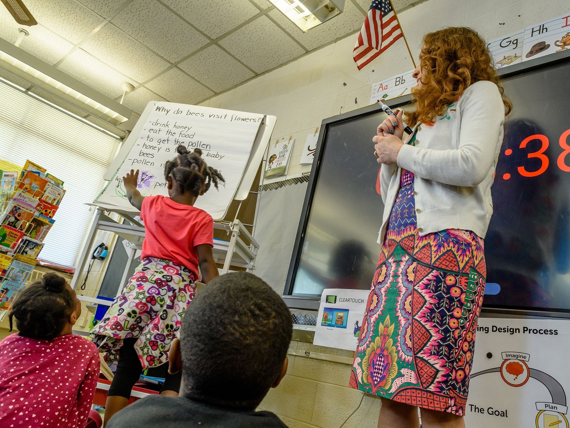Above, Carlone’s doctoral student Dearing Blankmann (far left) helps a kindergarten class explore the relationship between bees and flowers. Carlone’s work at MSPS is part of her larger STEM TLC project – the STEM Teacher Leader Collaborative. Co-founded in 2013 by Carlone and Dr. Jennifer Mangrum, TLC is a network of teachers enacting STEM in high-needs elementary schools in the region.