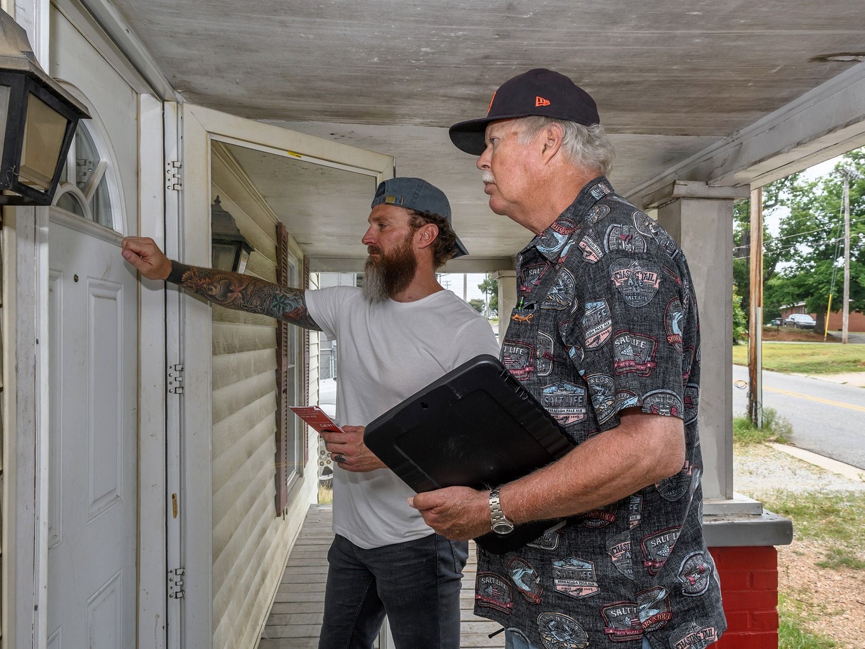 Center photo and right: social work graduate student Bryan Kendrick (center photo, left) conducts GCSTOP follow-up visits with Guilford County Sheriff’s deputy Harold Farlow. See more photos on UNCG Research Flickr.