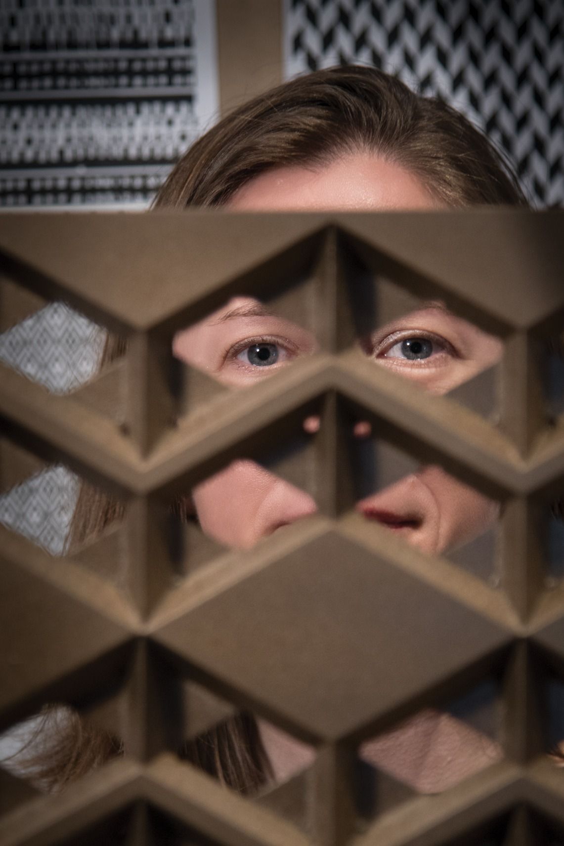 Inset photo above: Perrill, seen through a screen digitally fabricated for the gallery and inspired by the NC Museum of Art and African modernist architecture.