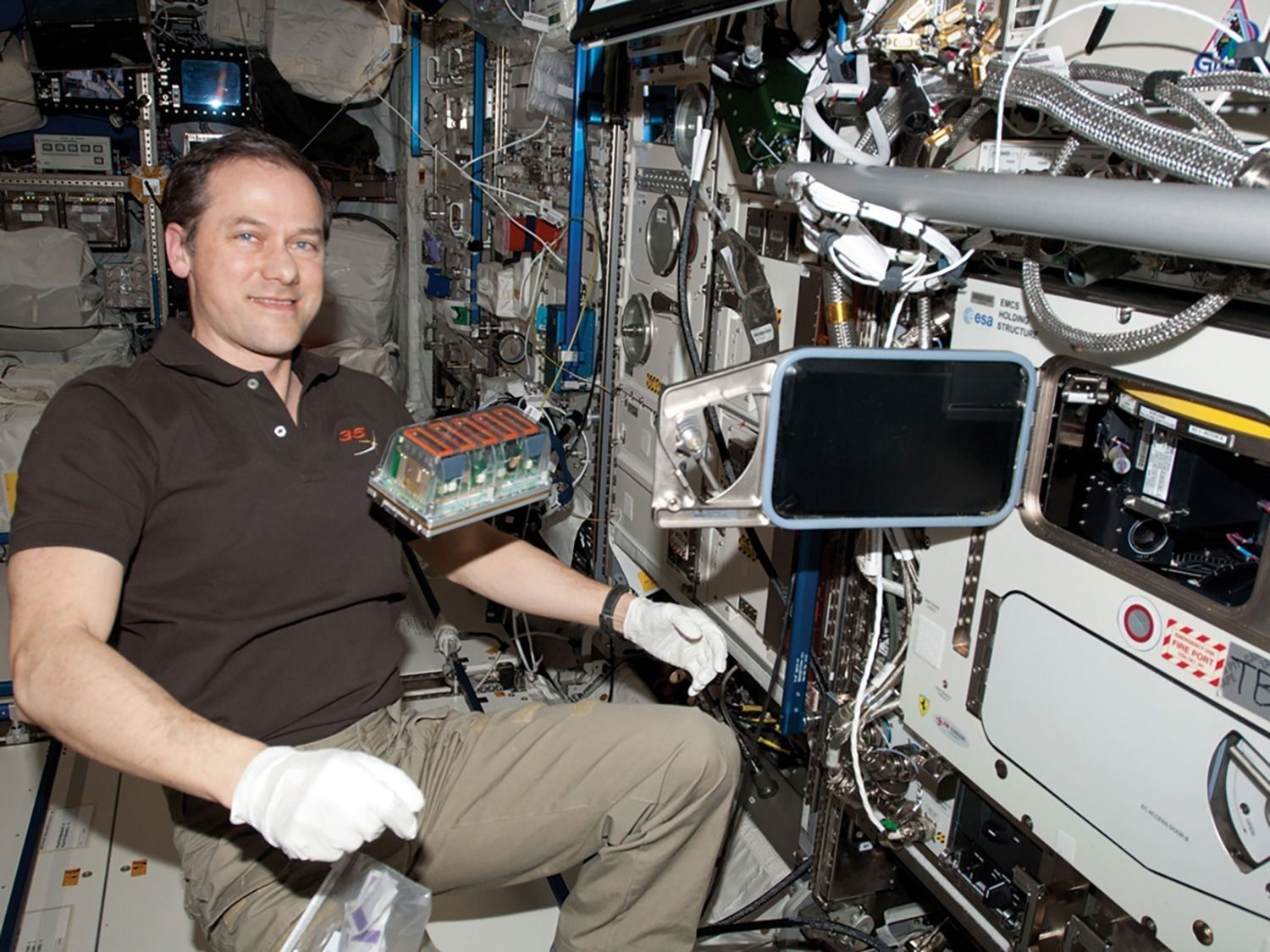 Above right: NASA astronaut Tom Marshburn retrieves an experimental container of seedlings, to be frozen and returned to Earth for further study. See more photos on UNCG Research Flickr.